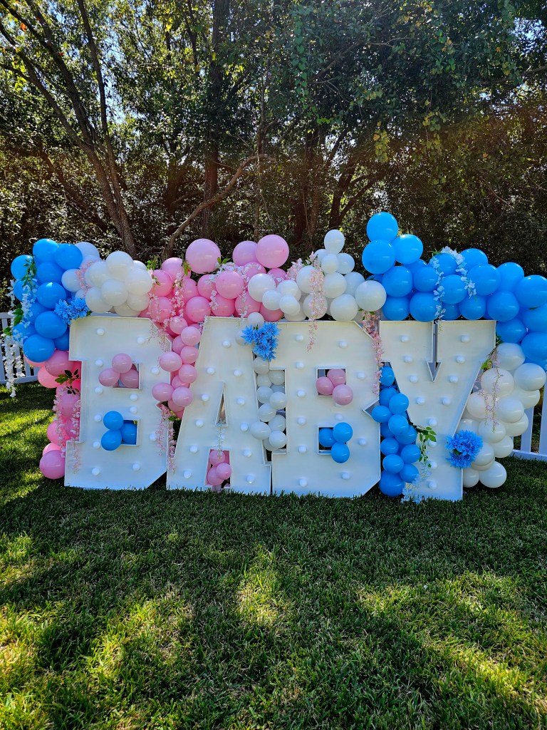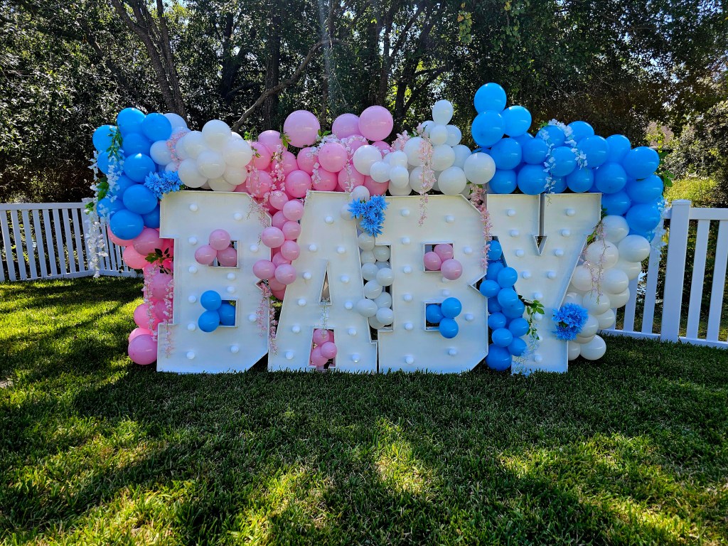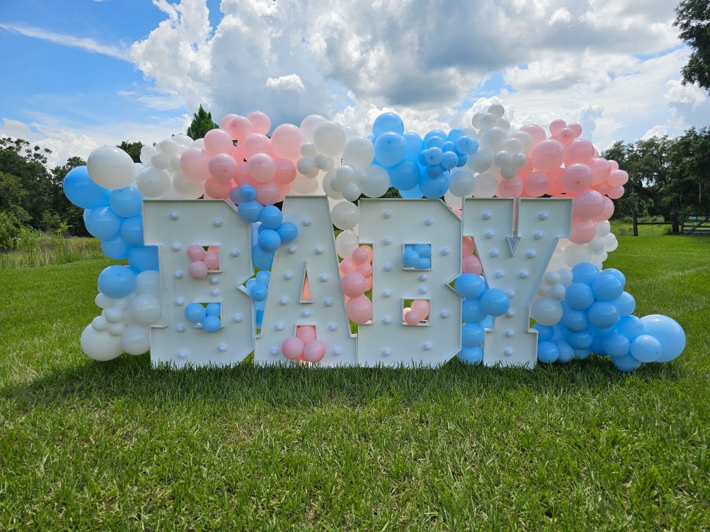 4 ft marquee light up letters with balloon garland and 3 colors of choice.