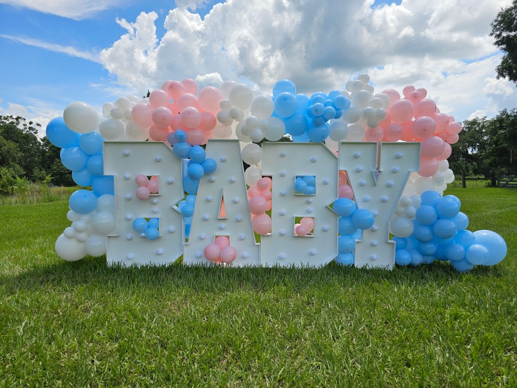 4 ft marquee light up letters with balloon garland and 3 colors of choice.